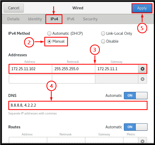 অপশন (3) অনুযায়ী আইপি (IPv4) অ্যাড্রেস এবং গেটওয়ে দেওয়ার পরে নিচের (4) নাম্বার অপশন অনুযায়ী DNS বক্সে প্রাইমারী এবং সেকেন্ডারী DNS অ্যাড্রেস বসাতে হবে। এখানে দুইটি (০২) পাবলিক DNS অ্যাড্রেস বসানো হয়েছে, চাইলে যে কোনো DNS অ্যাড্রেস বসানো যেতে পারে। DNS অ্যাড্রেস বসানোর পরে উপরের অপশন (5) অনুযায়ী ‘Apply’ বাটনে ক্লিক করতে হবে।