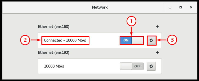 আগের স্ক্রিনসুট অনুযায়ী ‘Apply’ বাটনে ক্লিক করার পরে ‘Network’ সেটিংসের শুরুতে চলে আসবে। এখন নেটওয়ার্ক কার্ড (ens160) একবার ডিজাবেল (OFF) করে আবার এনাবেল (ON) করতে হবে। অর্থাৎ নিচের স্ক্রিনসুটের অপশন (1) অনুযায়ী সবসময় ‘ON’ থাকবে। আইপি (IPv4) সঠিক ভাবে কনফিগার হলে অপশন (2) অনুযায়ী ‘Connected’ লেখা আসবে।