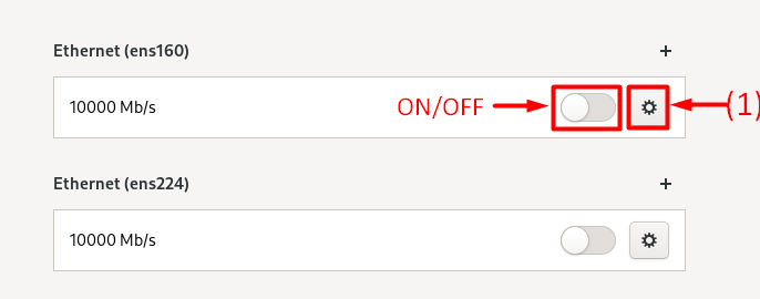 ‘Wired Settings’ -এ ক্লিক করলে নিচের স্ক্রিনসুট অনুযায়ী ইথারনেট কার্ডের (ens160) তথ্য আসবে। এখান থেকে গিয়ার বক্সে (Option 1) ক্লিক করে ম্যানুয়াল বা স্ট্যাটিক (Static) পদ্ধতিতে (IPv4) কনফিগার করা যাবে। পাশাপাশি বাম পাশের ‘ON/OFF’ বাটন প্রেস করে নেটওয়ার্ক কার্ড এনাবল (ON) ডিসাবেল (OFF) করা যাবে।