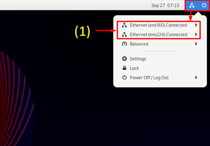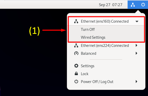 এই পোস্টে GUI (Gnome Desktop) ইউটিলিটি ব্যবহার করে আইপি (IPv4) কনফিগার করার পদ্ধতি দেখানো হবে। যেহেতু এখানে GUI (Graphical User Interface) পদ্ধতি ব্যবহার করা হবে, সুতরাং এই পদ্ধতিতে গ্রাফিক্যাল (Gnome) ডেস্কটপে লগইন করে নিচের স্ত্রিনসুট অনুযায়ী উপরের নেটওয়ার্ক আইকনের উপরে ক্লিক করলে, সিস্টেমে কতগুলা নেটওয়ার্ক ইন্টারফেস আছে (Option 1) সেগুলো দেখা যাবে।