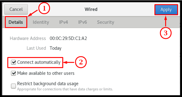 আগের স্ক্রিনসুট অনুযায়ী ‘Apply’ বাটনে ক্লিক করার পরে, নিচের স্ক্রিনসুটের অপশন (1) অনুযায়ী ‘Details’ ট্যাবে ক্লিক করলে কিছু সেটিংস আসবে। এখানে অপশন (2) অনুযায়ী ‘Connect automatically’ সিলেক্ট [√] করতে হবে। এটা সিলেক্ট করার উদ্দেশ্য হচ্ছে, সিস্টেম রিবুটের পরে নেটওয়ার্ক কনফিগারেশন যেন নিজে থেকেই চালু (ON) হয়ে যায়। এরপরে উপরের ডান পাশে অপশন (3) অনুযায়ী ‘Apply’ বাটনে প্রেস করতে হবে।