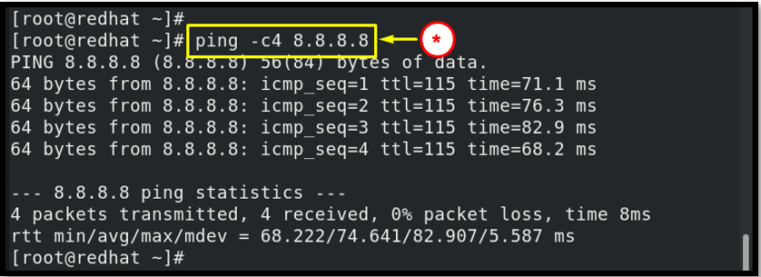 - নিচের কমান্ডের মাধ্যমে ‘Google DNS’ এর আইপি (8.8.8.8) কে ‘ping’ করে চেক করা হয়েছেঃ
