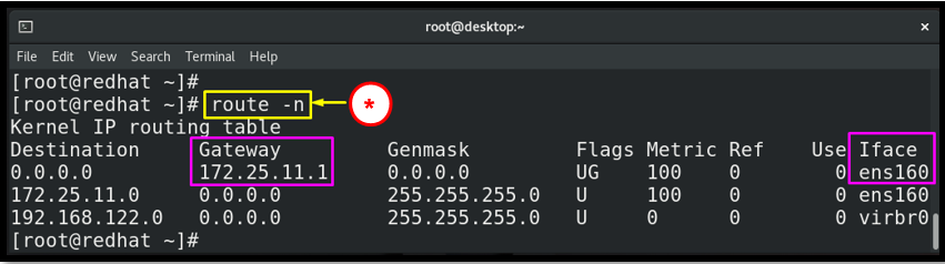 - গেটওয়ে, রাউটিং টেবিল এবং রাউট ইন্টারফেস চেক করার জন্য নিচের ‘route -n’ কমান্ডঃ