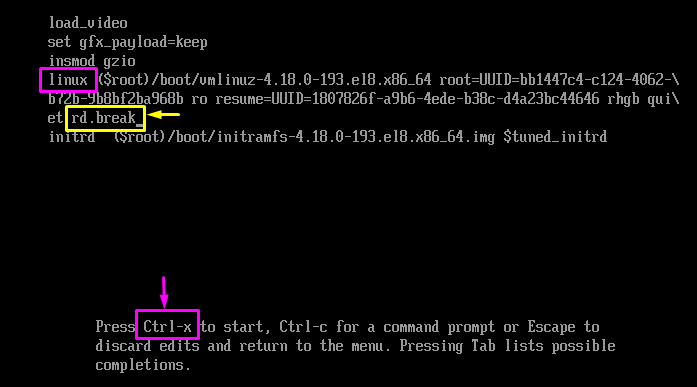 ➡ Step 03: মেনু এডিট করার পর নিচের স্ক্রীনসুটের মত দেখা যাবে। এখানে নিচের দিকে একটা লাইন শুরু হয়েছে ‘linux’ দিয়ে। এই লাইনের একেবারে শেষে চলে যেতে হবে এবং লিখতে হবে ‘rd.break’ এরপর ‘Ctrl-x’ প্রেস করলে সিস্টেম পুনরায় বুটিং শুরু করবে। এখানে ‘rd’ এর অর্থ ‘rescue disk’ ।