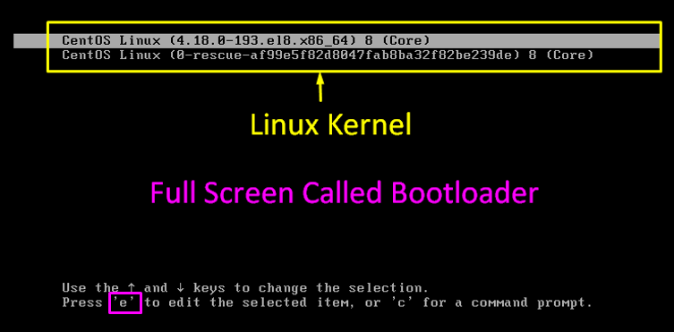 RHEL/CentOS 8 এর ‘root’ ইউজার পাসওয়ার্ড রিসেটের জন্য প্রথমে যেটা করতে হবে সেটা হচ্ছে, সিস্টেমে যখন বুট হবে, তখন বাইপাস মোডে বা ‘Emergency Mode’ –এ প্রবেশ করতে হবে। ‘Emergency Mode’ -এ প্রবেশ করার জন্য সিস্টেম যখন বুট হবে, তখন অপারেটিং সিস্টেমের বুট লোডার (GRUB2) থেকে ডিফল্ট কার্নেল এডিট করতে হবে। এরপর নিচের কাজগুলো ধারাবাহিকভাবে করতে হবেঃ