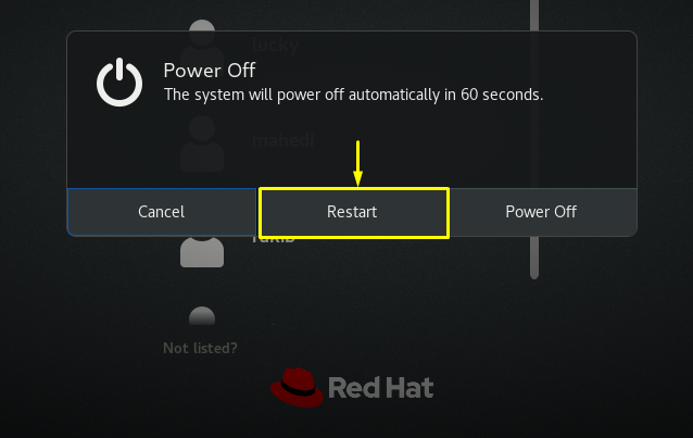 ➡ Step 01: প্রথমে CentOS/RHEL 8 সিস্টেমকে রিস্টার্ট (Reboot) দিতে হবে। রিস্টার্ট দেবার জন্য নিচের স্ক্রিনসুট অনুযায়ী গ্রাফিক্যাল মোডে মাউচ ব্যবহার করে রিস্টার্ট দিতে পারি অথবা কমান্ড কনসোল থেকে কীবোর্ড থেকে ‘Ctr+Alt+Del’ প্রেস করে রিস্টার্ট দিতে পারি।