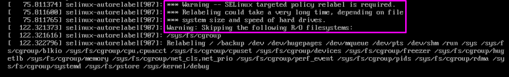 সিস্টেম রিবুট হতে কিছু সময় লাগবে, কারণ SELinux সিকিউরিটির কারণে সিস্টেমের সকল ফাইল/ডিরেক্টরি নতুন পাসওয়ার্ড পলিসি দিয়ে পুনরায় লেভেল (Relabel) করবে। সিস্টেম রিবুটের পরে নরমাল মোডে চলে আসলে নতুন পাসওয়ার্ড দিয়ে লগইন করতে হবে।
