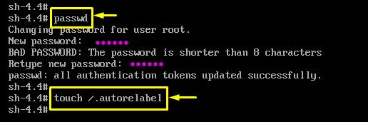 ➡ Step 05: এখন ‘passwd’ কমান্ড প্রেস করে নতুন রুট (root) পাসওয়ার্ড সেট করতে হবে, প্রথম বার পাসওয়ার্ড দেওয়ার পরে পুনরায় আরেকবার দিতে হবে। ‘SELinux’ পলিসি যেন নতুন করে ‘relabel’ করে এইজন্য রুট ‘/’ পার্টিশনের মধ্যে ‘.autorelabel’ নামে একটি লুকানো (Hidden) ফাইল তৈরি করতে হবে।
