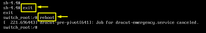 ➡ Step 06: পাসওয়ার্ড রিসেটের কাজ শেষ, এখন দুই (০২) বার ‘exit’ কমান্ড দিয়ে শেল থেকে বের হতে হবে এবং সিস্টেম নতুন করে বুট হওয়ার পরে পূর্ণ ফাইল সিস্টেম SELinux’ পলিসি দিয়ে নতুন করে‘relabel’ হতে কিছুক্ষণ অপেক্ষা করতে হবে।