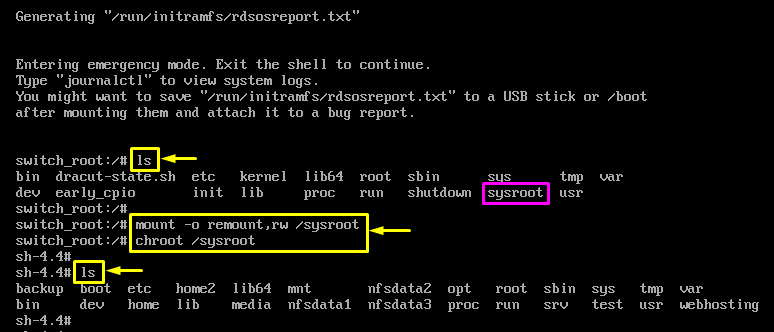 ➡ Step 04: সিস্টেম বুটিং এরপরে নিচের মত কমান্ড ইন্টারফেস আসবে এবং এখানে নিচের কমান্ডগুলো ব্যবহার করতে হবে। যেহেতু বুট হওয়ার সময় অস্থায়ী রুট ফাইল সিস্টেম (initramfs) read only (ro) মোডে থাকে, এই জন্য এটাকে নতুন করে read write (rw) মোডে ‘/sysroot’ ডিরেক্টরির মধ্যে মাউন্ট করতে হবে। এখানে ‘/sysroot’ ডিরেক্টরির মধ্যে মিনিমাম ফাইল সিস্টেম এবং প্রয়োজনীয় লাইব্রেরী (lib) ফাইল থাকে। ‘chroot’ কমান্ডের মাধ্যমে ‘/sysroot’ ডিরেক্টরির মধ্যে প্রবেশ করতে হবে।